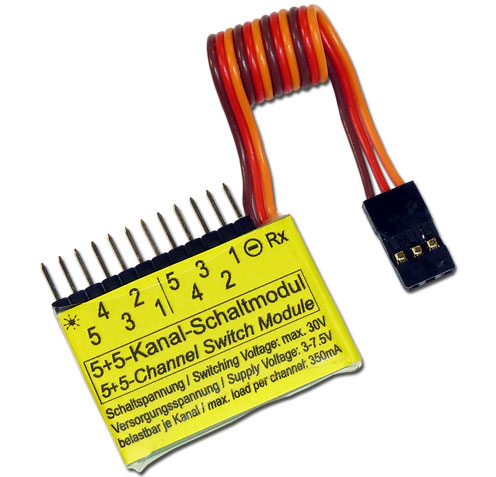 • Anders als beim 10-Kanal Schalter werden hier 2x 5 Funktionen geschaltet. Durch Betätigen des Steuerknüppels in eine Richtung (z. B. nach oben) werden die ersten 5 Funktionen geschaltet. Durch Betätigen des Knüppels in die andere Richtung (z. B. nach unten) werden die zweiten 5 Funktionen geschaltet. Dies bietet mehr Komfort als beim 10-Kanal Schalter, da der Steuerknüppel entsprechend weniger betätigt werden muss. Allerdings bietet der 5+5-Kanal Schaltbaustein keine schaltbaren Blinkfunktionen.