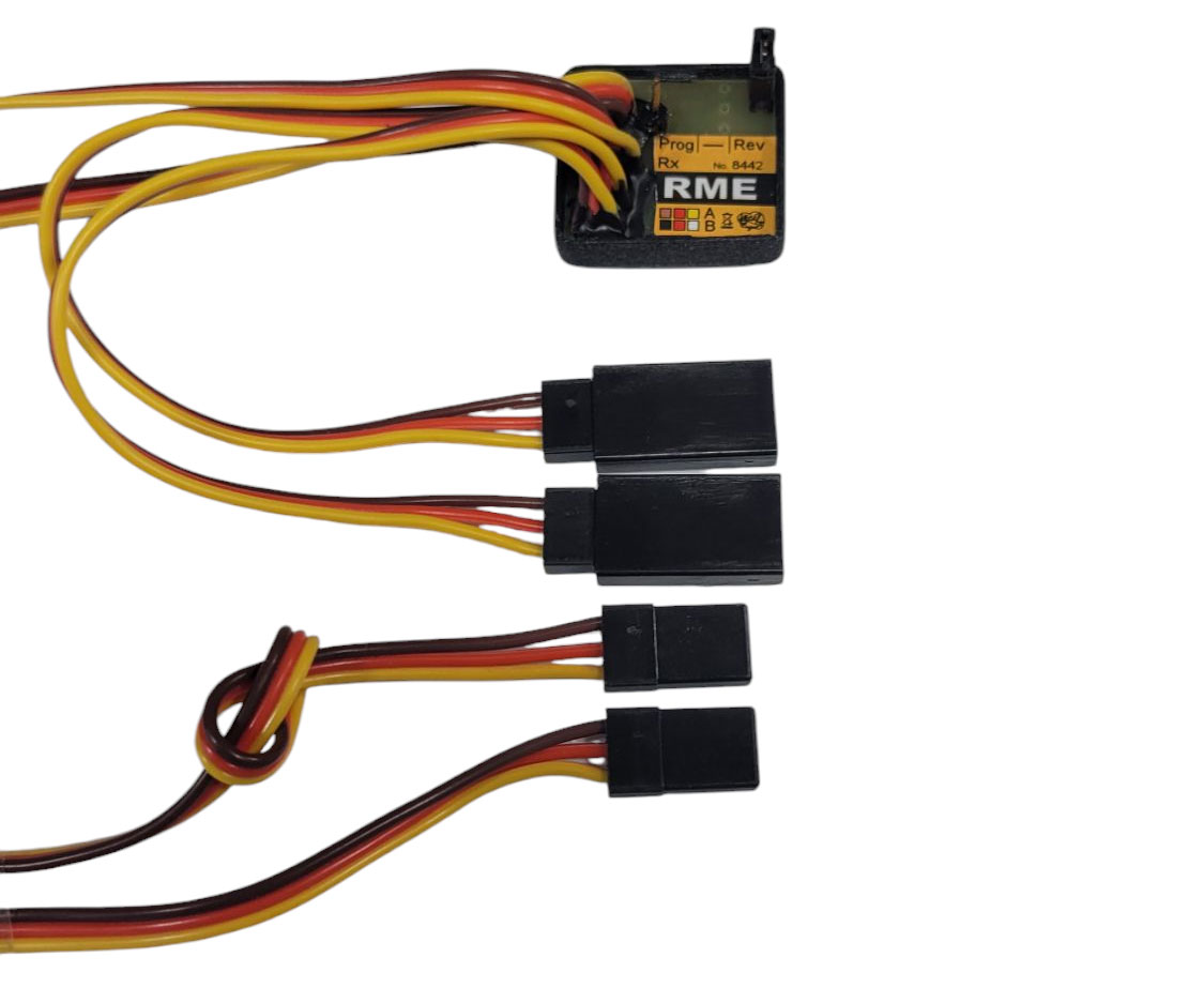 • Ansteuerung: Sobald Masse (also "minus") der Empfängerstromversorgung an dem auf der RME mit "-" gekennzeichneten Pin anliegt, fahren die Ruder aus. Die Ansteuerung zum Ein- und Ausfahren der Ruder kann entweder über einen Decoder (z. B. robbe Multi Switch, Graupner nautic) oder über einen elektronischen Schalter (z. B. 4-Kanal-Schalter MINI, Art.-Nr. 8431) erfolgen.
