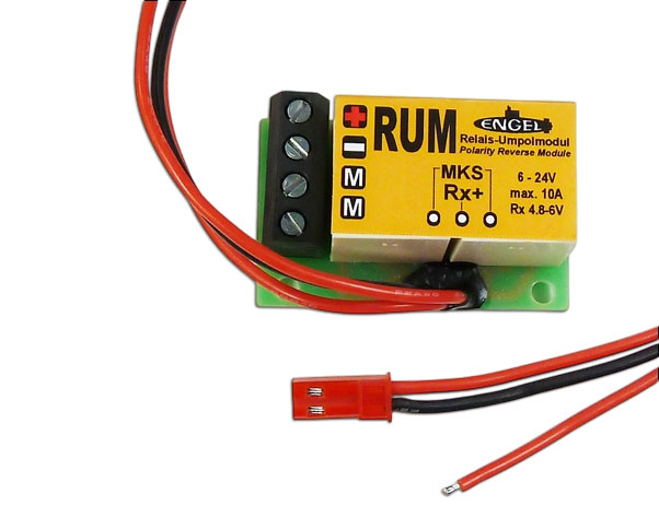 Doppel-Schaltrelais mit Anschlußkabel für 4-Kanal-Schaltbaustein MINI (Nr. 8431) zur Erhöhung der Schaltleistung auf 10 A. Die Relais sind bereits so verschaltet, daß sich nach Anschluß von 4-Kanal-Schaltbaustein MINI, Motor und Akku (Hauptakku+/-, Empfängerakku+) die Funktionen vorwärts-stop-rückwärts ergeben. Geeignet zum Schalten von Sonderfunktionen mit hohem Stromverbrauch, wie Pumpen, Elektromotoren etc.