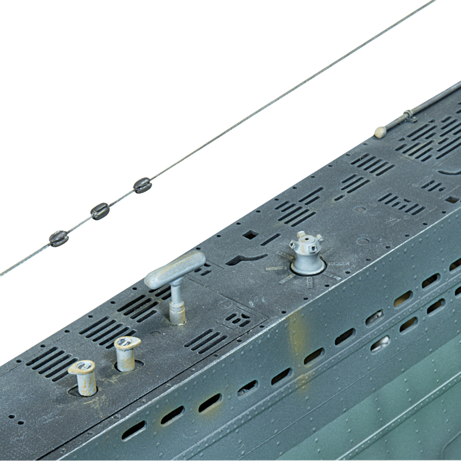 Alle Beschläge, einschl. der Bauteile für das 8,8 cm Geschütz und die 2 cm Flak, sind passgenau aus Resin gegossen. Diese Teile, wie Klüsen, Klampen, Poller, Spill und Anker, sind originalgetreu nachgebildet. Das Rundumhorchgerät dient gleichzeitig als Verschluss für die vordere Revisionsklappe. Die beiden anderen Klappen werden ebenfalls unsichtbar mit Magneten verschlossen.
